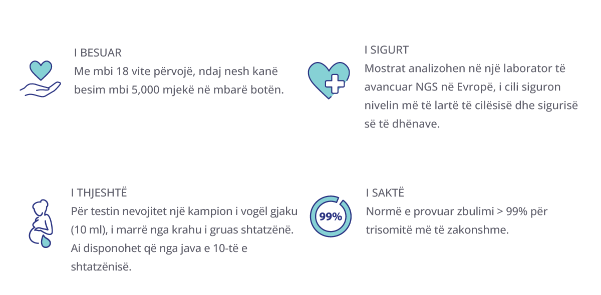Në pritje të kontrollit të parë të shtatzënisë shpesh duket si një përjetësi, kështu që gratë shtatzëna kanë mbetur me shumë pyetje pa përgjigje. Ato dilema mund të shkaktojnë shqetësim, frikë, ose edhe ankth. Por nënë e ardhshme – merr frymë thellë dhe besoni se fëmija juaj është i shëndetshëm. Ju mund ta konfirmoni atë shpejt dhe lehtë me testin NIFTY by GenePlanet, një test jo-invaziv që bëhet para lindjes. Nga java e 10-të e shtatzënisë, testi NIFTY mund të zbulojë me saktësi nëse fëmija ka ndonjë anomali gjenetike. Testi NIFTY nuk paraqet rrezik për ju dhe foshnjën, por ju siguron që të keni një shtatëzani të qetë dhe të lumtur.