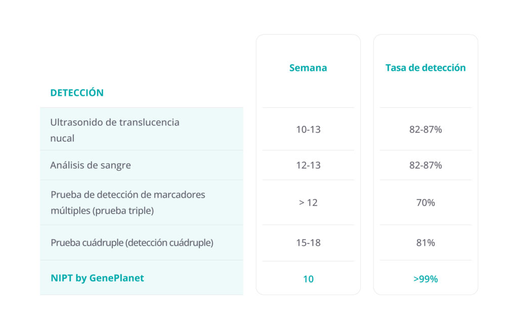 La prueba NIPT by GenePlanet es mucho más precisa que la exploración de translucidez nucal. Su tasa de detección de las tres trisomías más comunes presentes al nacer es superior al 99%.